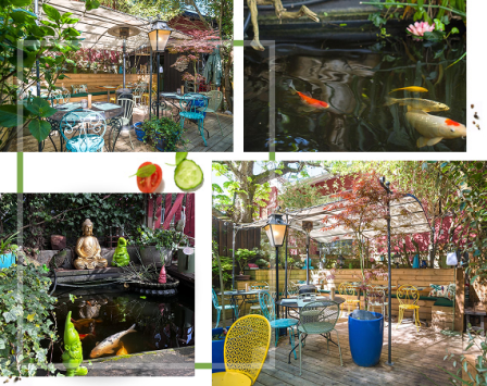 Vous serez accueillis dans un cadre exotique à l'ambiance bucolique et vous dégusterez une coupe de champagne ou un spritz dans l'attente de savourer nos spécialités culinaires.